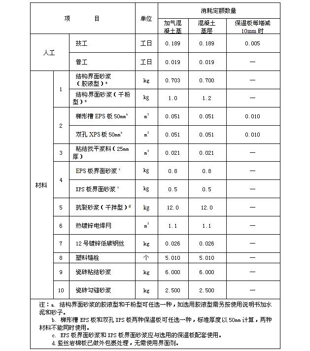 4.0.2  贴砌保温板做法采用胶粉聚苯颗粒粘结找平浆料(以下简称粘结找平浆料)满粘、贴砌双面涂刷保温板界面砂浆的梯形槽EPS板、双孔XPS板或竖丝岩棉板,板间留10mm板缝,贴砌后用粘结找平浆料填平板缝及XPS板的两个孔洞,以增强保温板与粘结层、找平层的连接性能,提高系统的透气性;其表面再抹10mm厚粘结找平浆料,形成复合保温层并提高该做法的防火性能。其基本构造见表4.0.2。